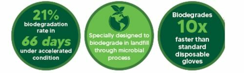 BioGlove Nitrile Disposable Gloves are enhanced with the latest technology to allow them to biodegrade in anaerobic conditions in landfills. BioGlove is certified through Biomethane Potential Testing (BPM) according to ASTM D5511. BioGlove is certified to biodegrade in accelerated conditions by 21% within 66 days, up to 10 times faster than regular nitrile disposable gloves. BioGlove offers an ‘end life solution’ for reduction of waste. Consumers simply need to place used BioGlove disposable gloves in the rubbish bin. BioGlove Disposable Gloves are a lightweight green nitrile glove that is suitable for a broad range of applications. Lightweight comfortable nitrile is highly dexterous allowing the user excellent grip and feel. BioGlove Nitrile Disposable Gloves are powder free, single use only. Certified Biodegradability to ASTM D5511. |