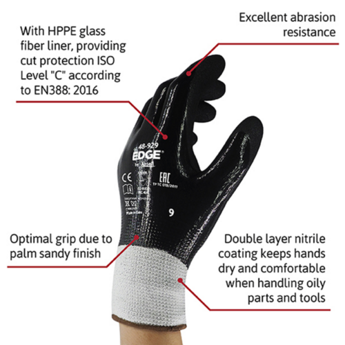 Enhanced features: EDGE 48-929 hand protection gloves’ elastic knitwrist grants a secure and snug fit around the wrist, making them ideal for workers handling small and medium-sized sharp components coated with oils or lubricants.