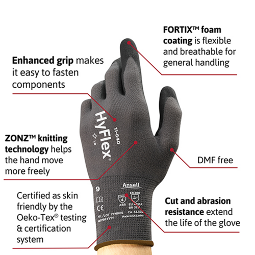Elevated comfort: HyFlex 11-840 safety gloves’ ZONZ Comfort Fit Technology relieves tension, for optimal comfort.