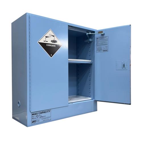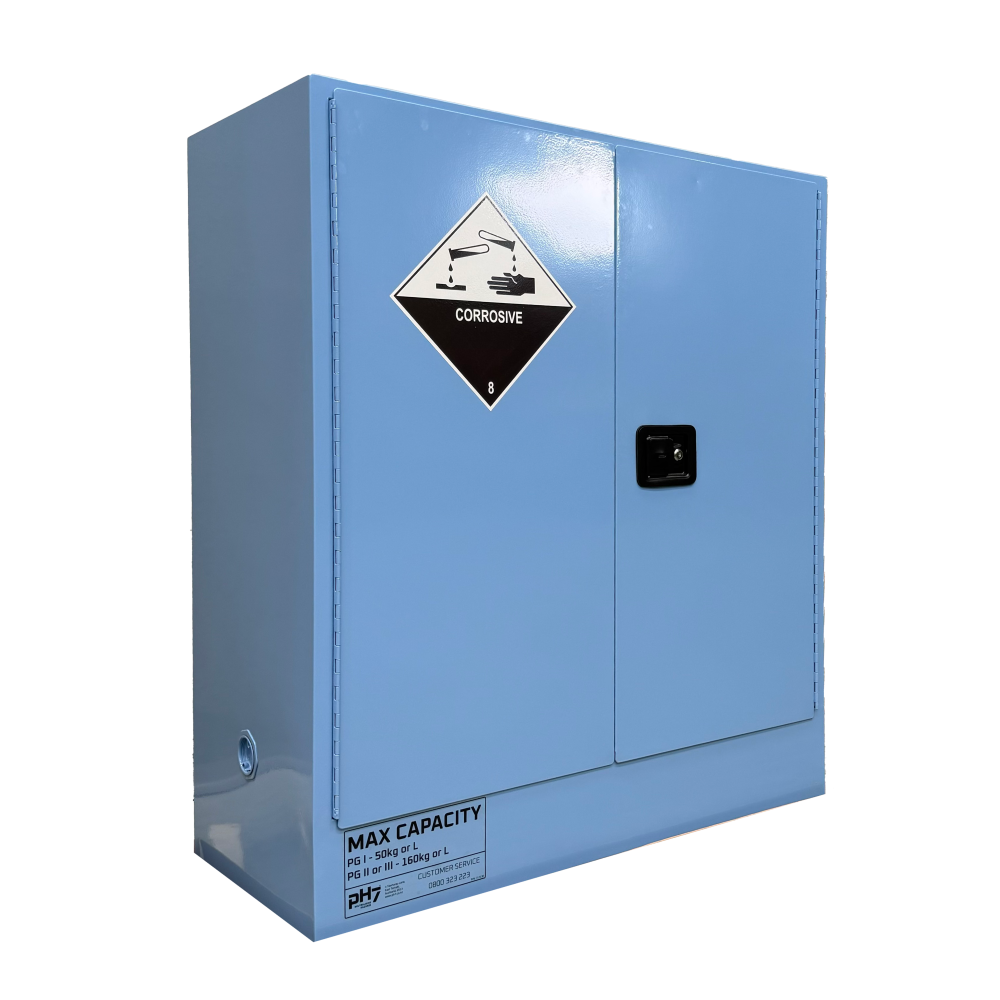 Suitable for storage of class 8 corrosive substances in liquid or solid form including acids, alkalis, caustics, sodium hydroxide solutions and hypochlorite solution.