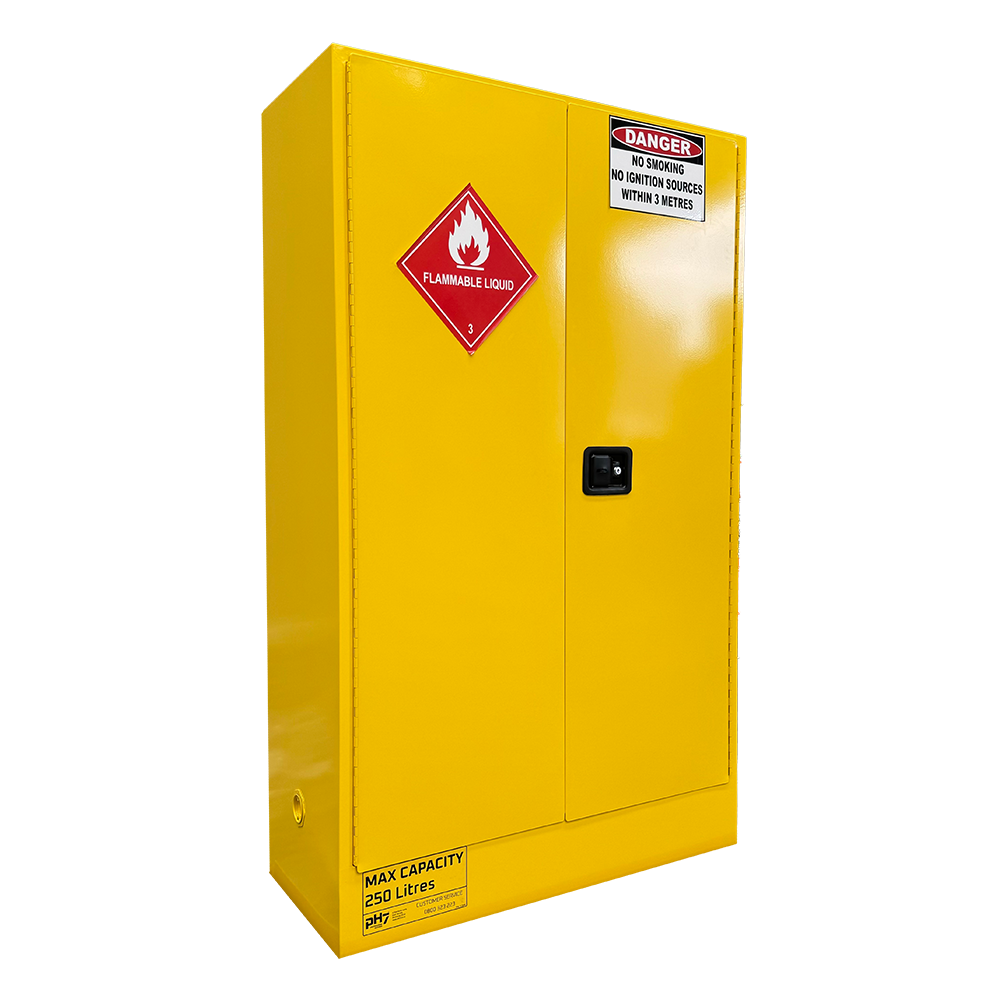 Double door flammable liquid storage cabinet with 250L capacity.