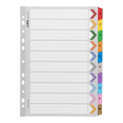 Icon Cardboard Dividers are great for organising and colour coding work and projects. Dividers with reinforced plastic tabs, designed for heavy duty use. Multi punched reinforced spine for use with all ring binders. Comes with a seperate colour coded contents page for easy referencing. 1-10 numerical tabs. A4 size. Assorted colours.