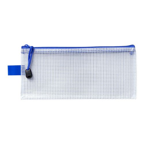 Icon Mesh Bags are made from strong, water-resistant, clear and flexible plastic PVC material. Includes a reinforced fabric mesh for extra strength and a sturdy, blue, fabric zipper closure. Pencil Case 230mm x 105mm size.