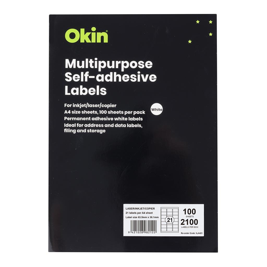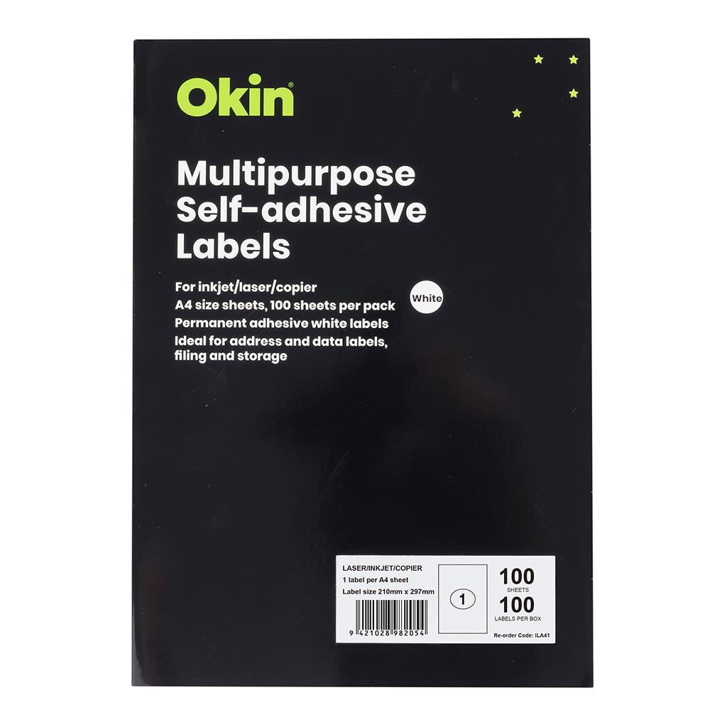 Okin Multipurpose Labels 1 Per Sheet 210x297mm, Pack of 100