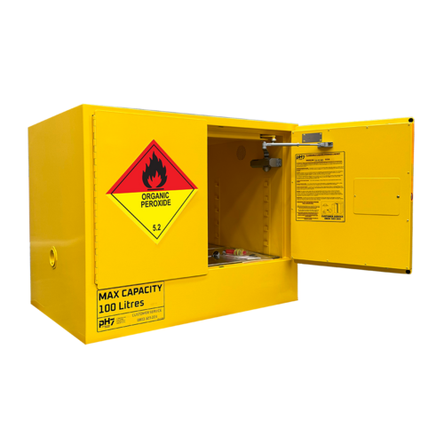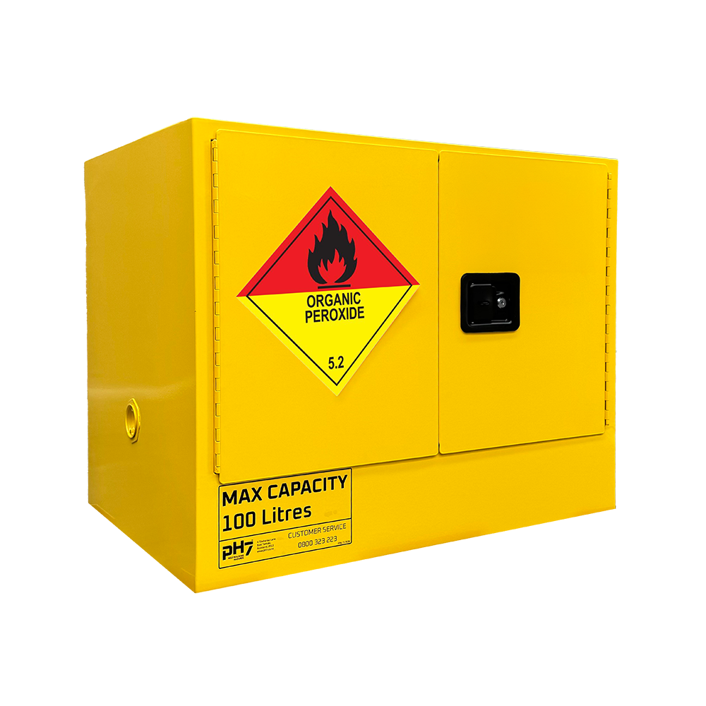 Suitable for storage of class 5.2 organic peroxides in liquid or solid form including chemicals such as acetylacetone, peroxide, methyl ethyl ketone peroxides and dibenzoyl peroxide.