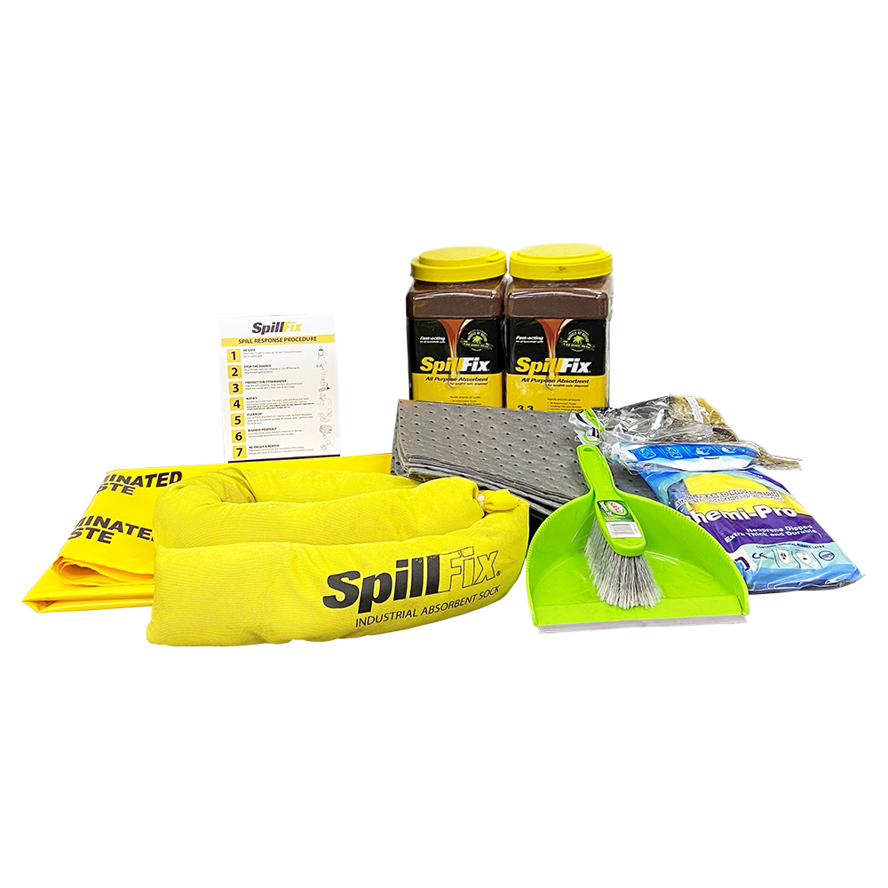 The spill kit contains a mixture of loose absorbent fibre, absorbent socks and pads as well as the necessary PPE including gloves and a respirator plus instruction card and disposal bags.