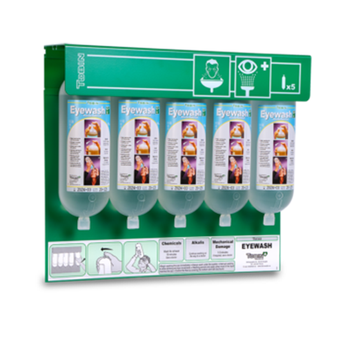 5 x 1 Litre borate-based eyewash bottles in a wall-stand.